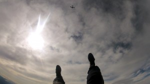 Seul problème, on est sensé formé une étoile tous les six, mais mon absence de combinaison rend ma navigation plus compliquée. Je n’ai pas de résistance à l’air et je chute vite, trop vite, me retrouvant rapidement beaucoup plus bas que les autres. Un coup d ’œil vers le ciel, laissant filer un regard de chien battu criant à l’abandon… et aussitôt tout le monde fonce vers moi pour continuer la fête en ma compagnie. L’heure de se séparer avant de déployer, un petit tracking et c’est parti. La descente se termine par un atterrissage en douceur pour lequel je me ravi – je n’étais pas vraiment en tenue pour encaisser un crash cette fois-ci.