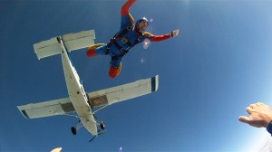 13h30, le soleil reprend possession des lieux. Je pars enfin pour un saut à 13 000 pieds avec Jake, Sue et Ben. Ce dernier faisant office de cameraman pendant que nous trois, après une sortie détachée, on essaye de se rassembler en étoile pour réaliser quelques figures. En réalité et une fois de plus, Ben à oublié de déclencher sa caméra. De notre côté, Jake et Sue ont réussi à se rassembler. Quant à moi, j’ai passé l’ensemble de la descente à essayer de les rejoindre, en vain. J’étais proche pourtant, à un demie mètre, tout au plus. Le juste milieu étant toujours difficile à trouver. Lorsqu’il s’agit de rejoindre un groupe, il ne faut jamais aller trop vite dans leur direction, car on risque une collision qui peut être fatale. Dans l’autre sens, si on ne va pas assez vite, on n’arrivera jamais à les rejoindre. Me voilà donc perdu entre ces deux extrêmes.